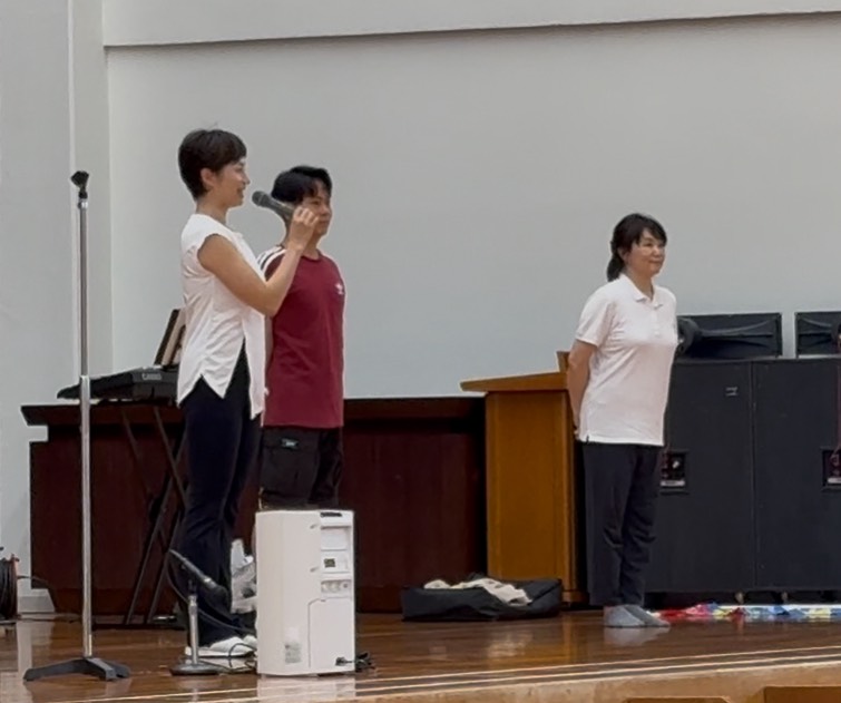 今年から簡易保険加入者協会様のお力をお借りし、講師にはラジオ体操連盟指導委員の押味愛里沙さんと、NHKテレビ・ラジオ体操アシスタントの石川裕平さんのお二人に、ピアノ演奏には愛知県ラジオ体操連盟理事の小竹亜弥さんをお迎えして、生演奏でお教えていただきました。